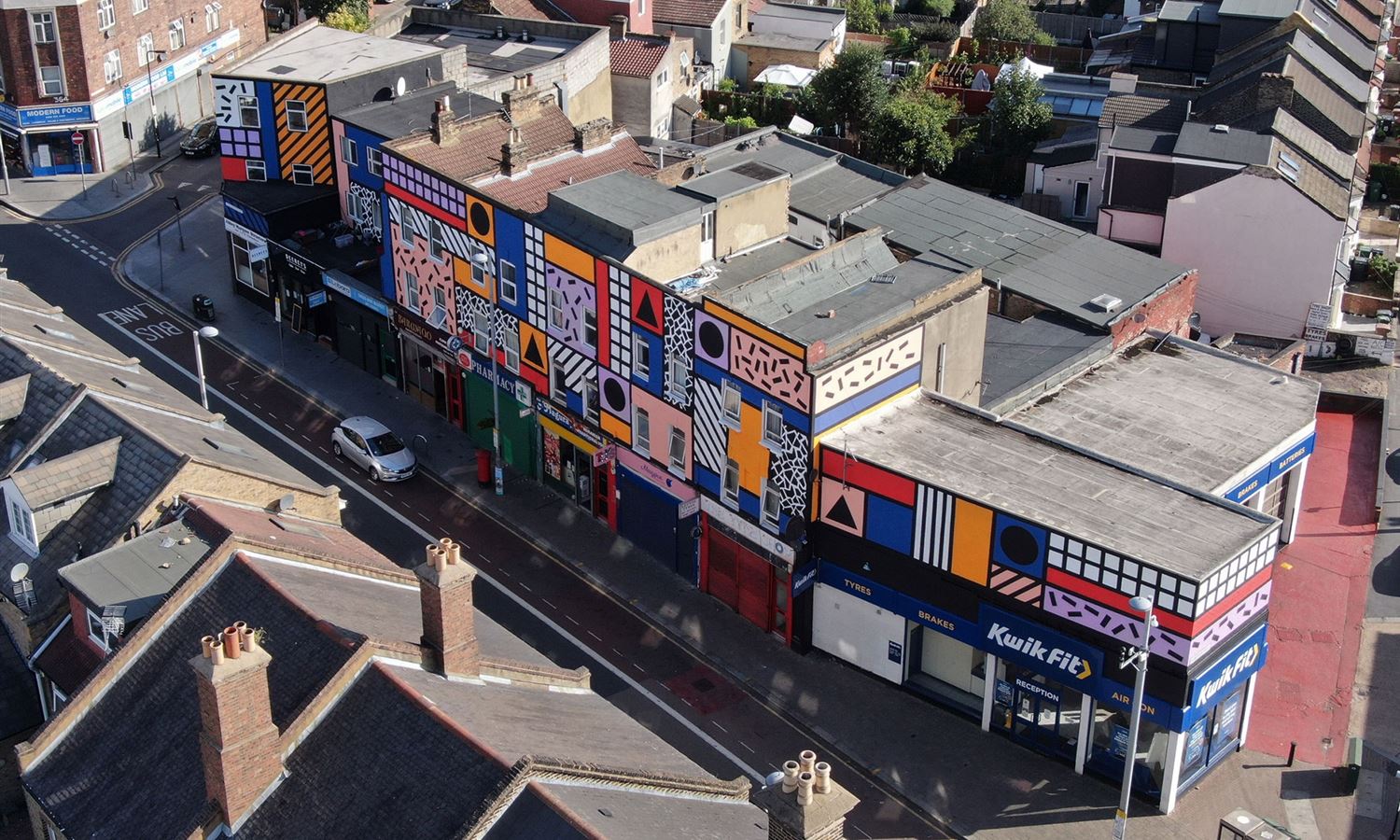 Residents of London's Leyton neighbourhood have crowdfunded the overhaul of an entire block on their local high street, recruiting designer Camille Walala to decorate it with a large-scale mural in her colourful, signature style.