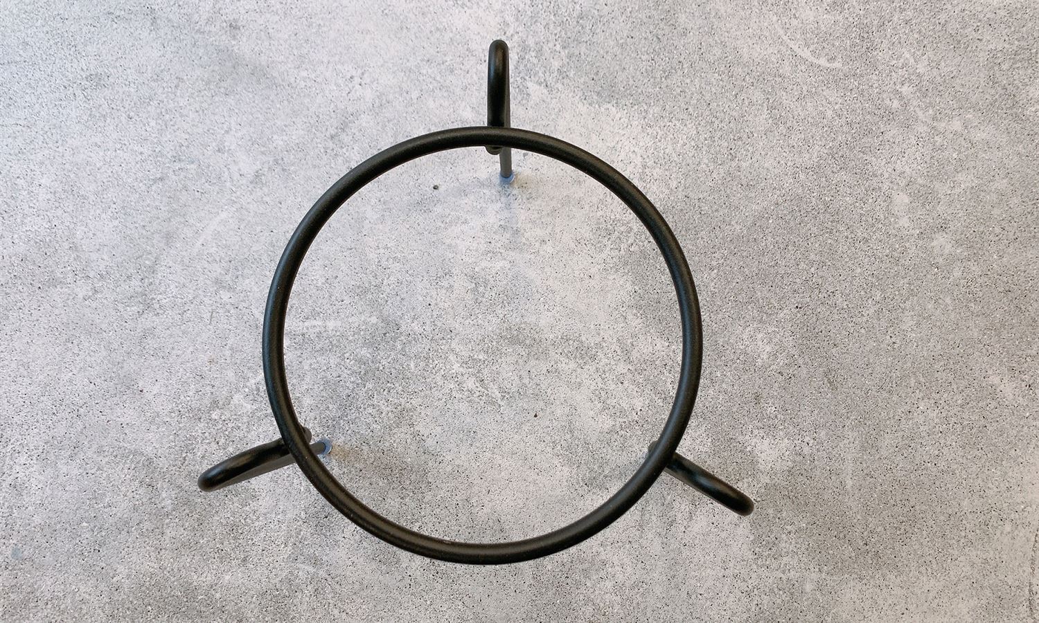 To preserve the individual beauty of these two materials the seat is simply placed on top of the frame. It's propped up by a central ring and held in place by three kinked legs, rather than being physically joined together.