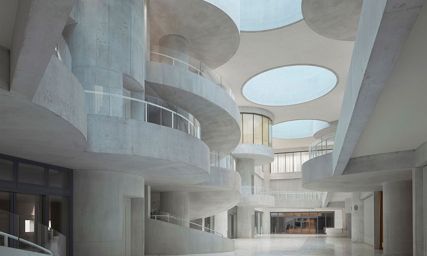 Surrounding the atrium a series of spiral staircases, round load-bearing pillars and circular balconies animate the space.