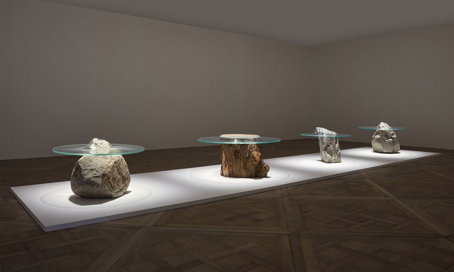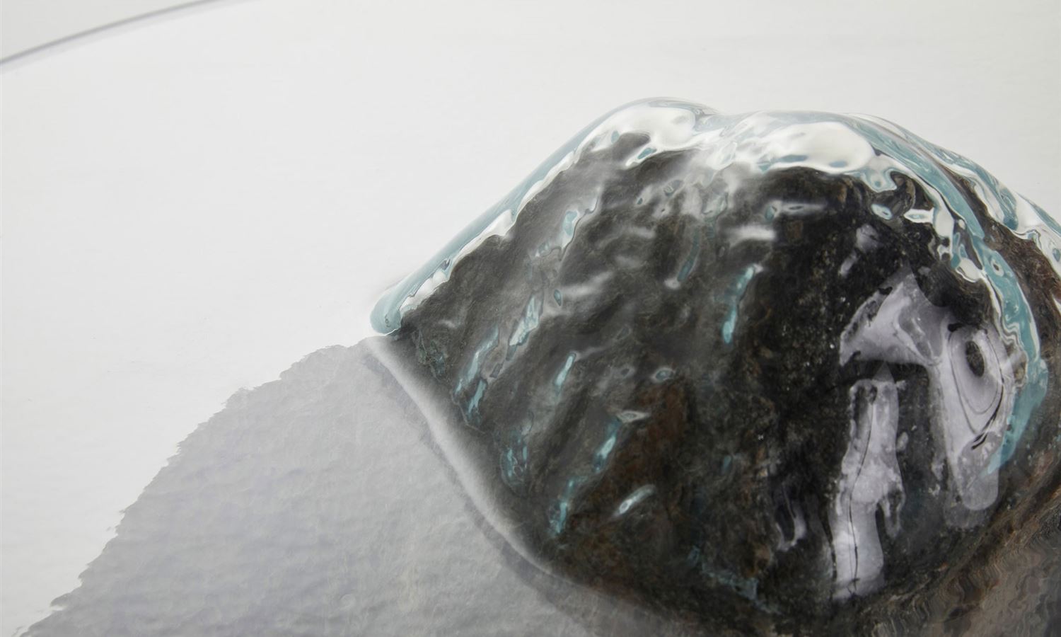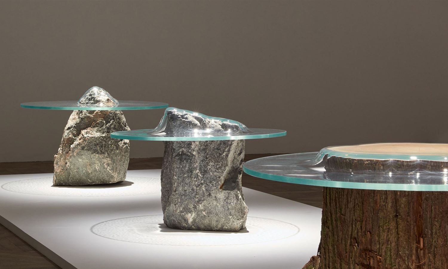 Cocksedge worked with craftspeople in the UK to create each of the tables, stretching the glass under high temperatures and pressing it over large sections of rock, concrete wood or steel.