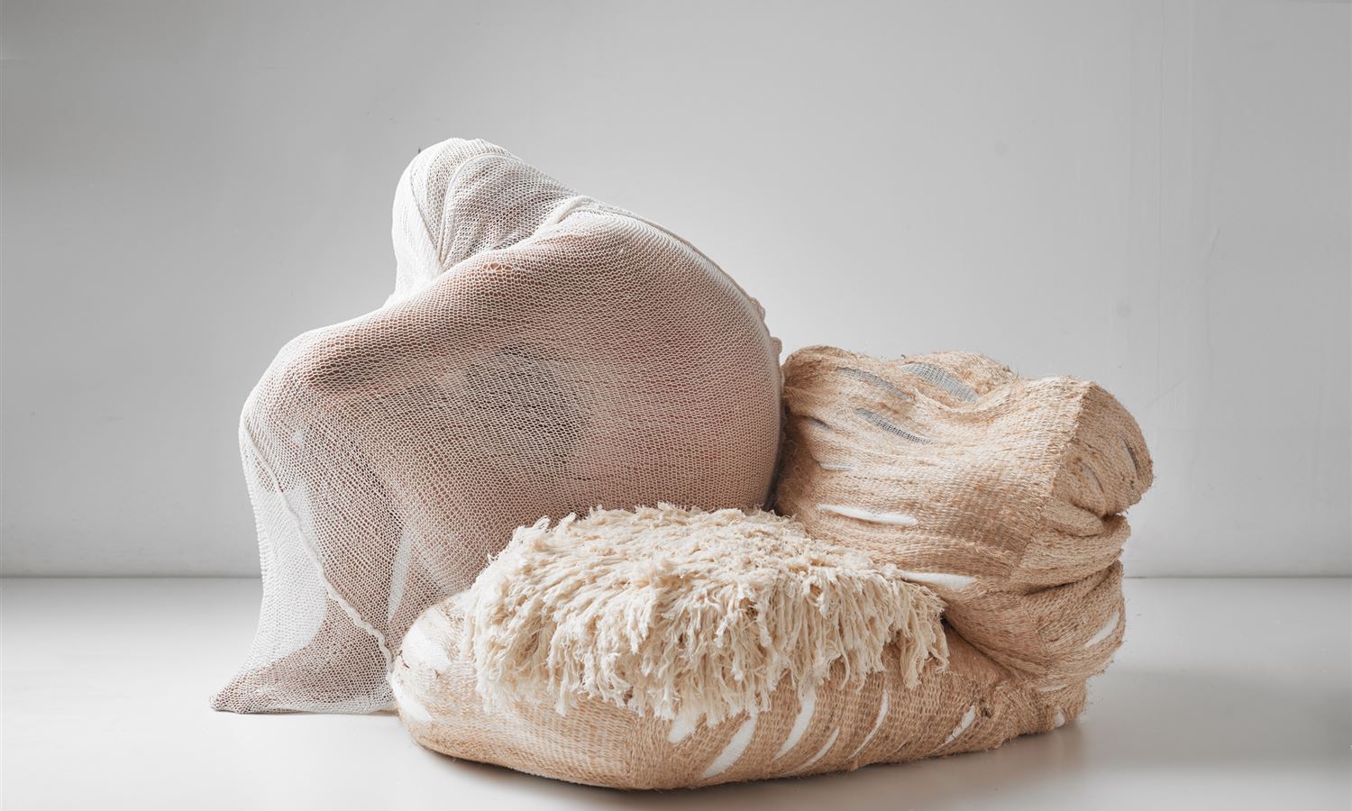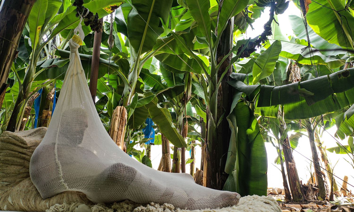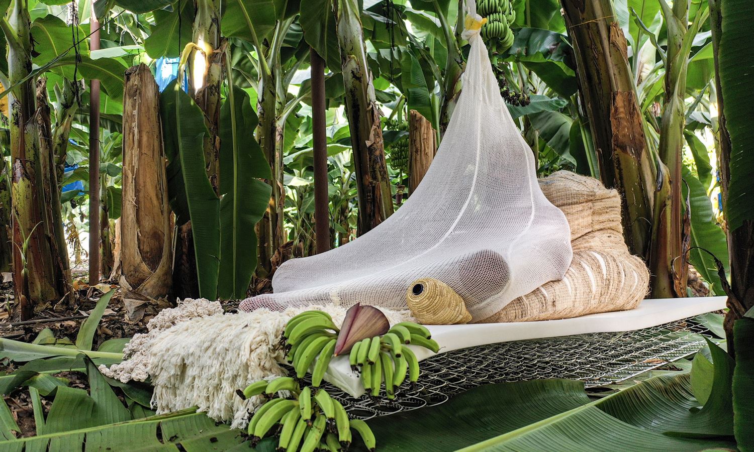 The installation imagines a future city that has been transformed into a jungle-like climate due to rising temperatures and sees its inhabitants take refuge in woven bags and hammocks made from banana fibers.