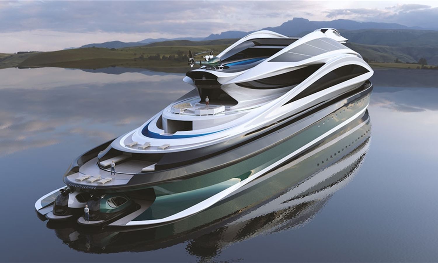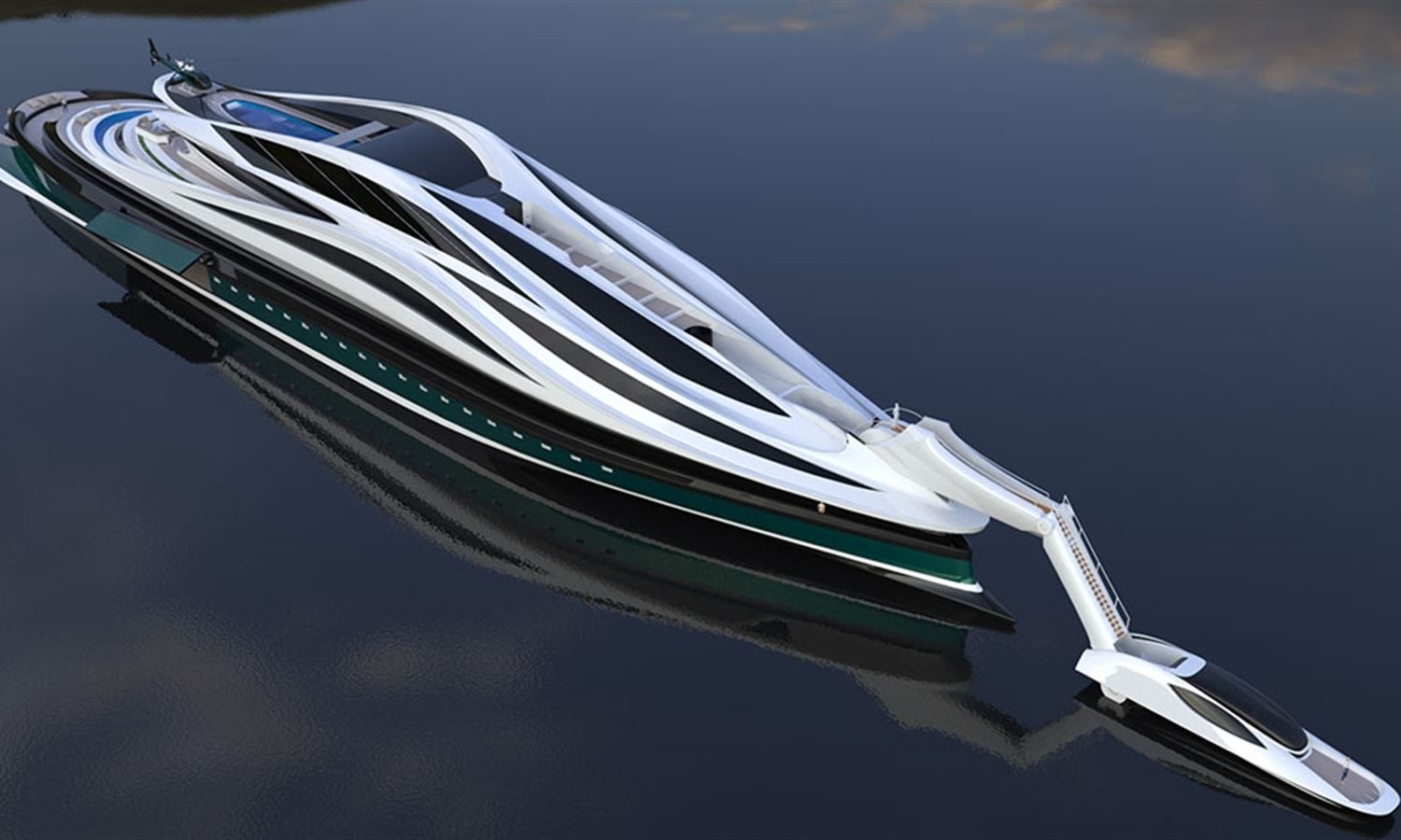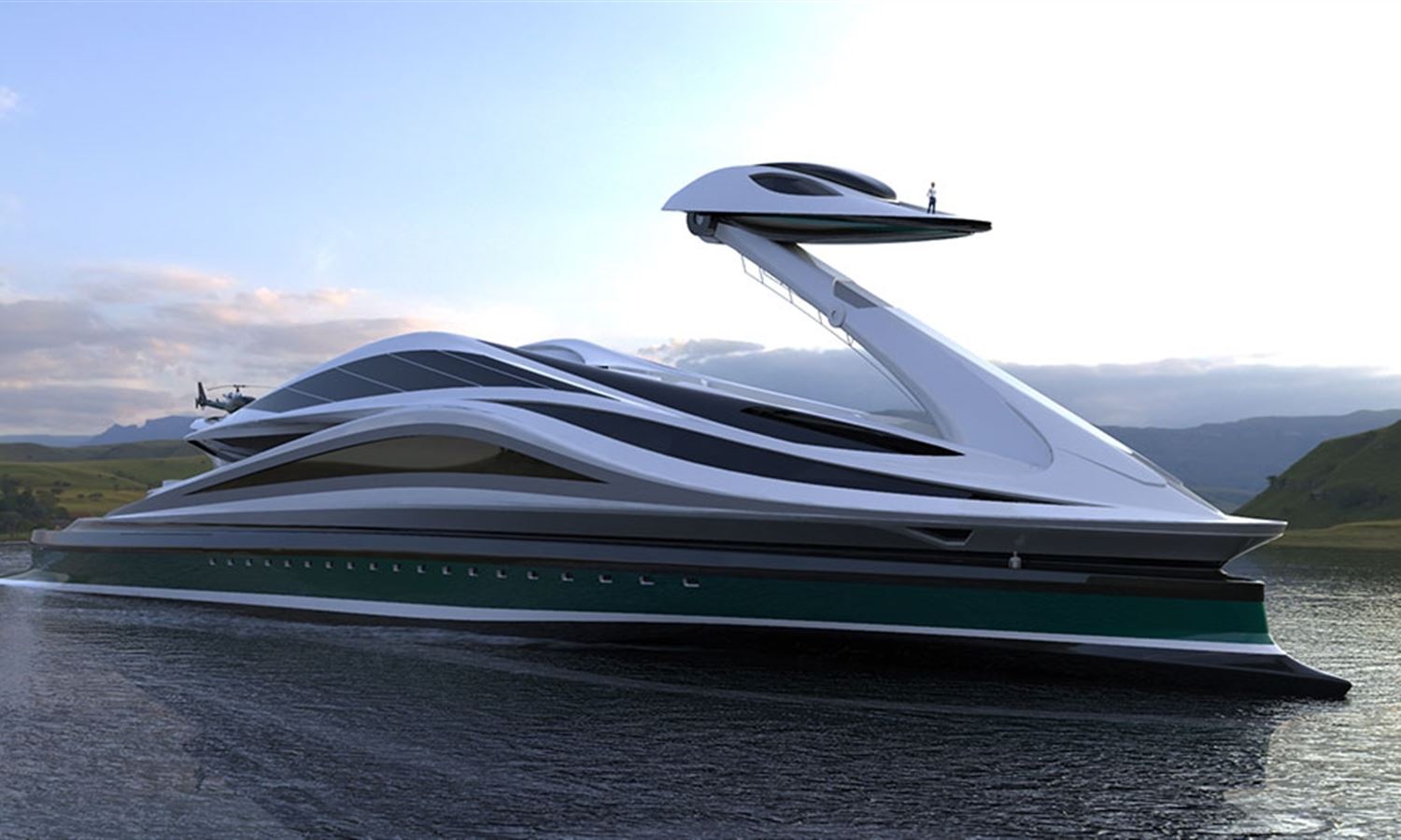 The control center is supported by a flexible “neck” that employs a fulcrum to give it a full range of movement. When swanning about, it drops to the middle of the megayacht to help steer it in the right direction. Conversely, when the vessel is at anchor, the neck lowers the head to the water where it detaches for independent cruising.