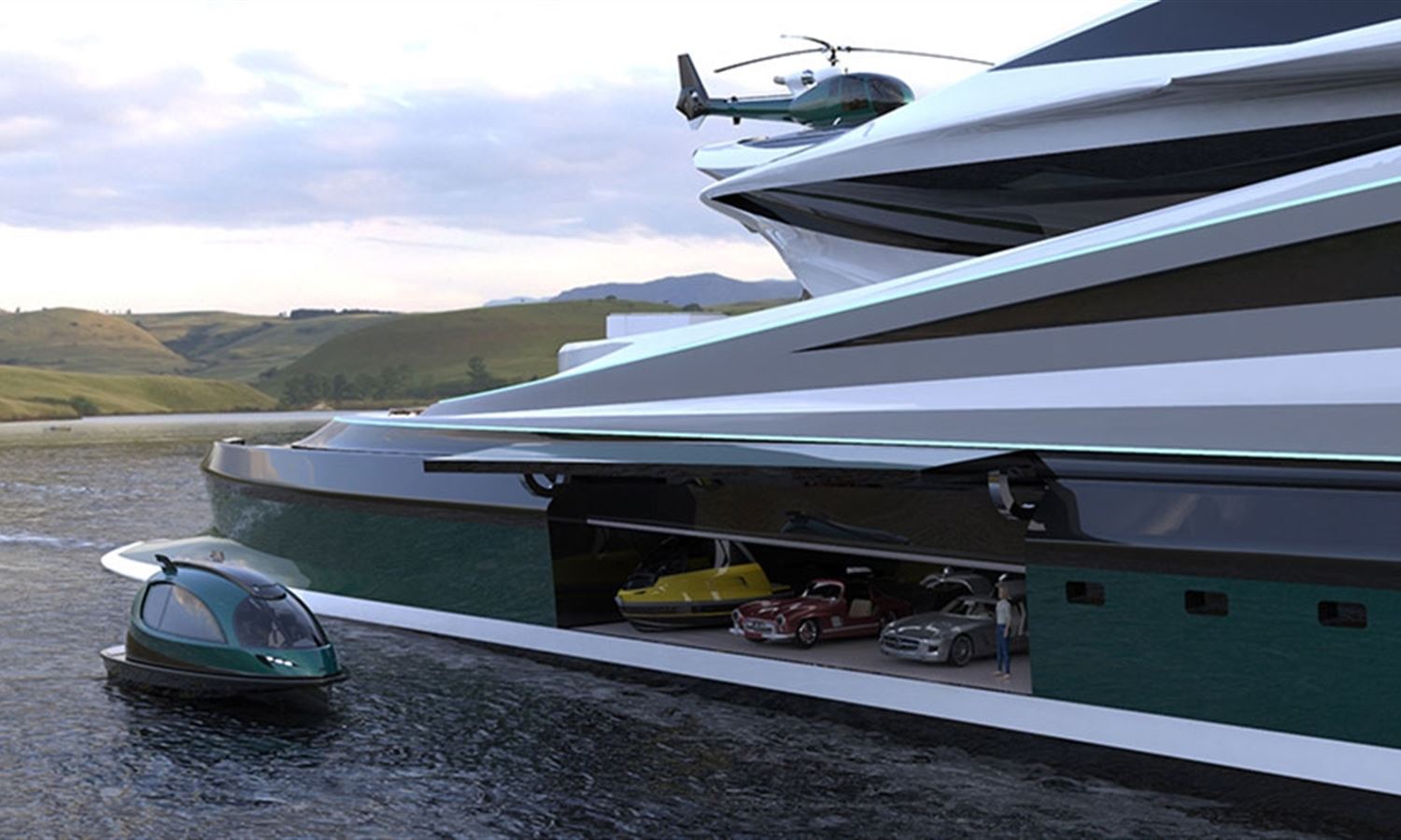 Toys come in the form of a helicopter on the top level, a pair of Lazzarini’s jet capsules that are located aft, and a haul of supercars which sit amidships.