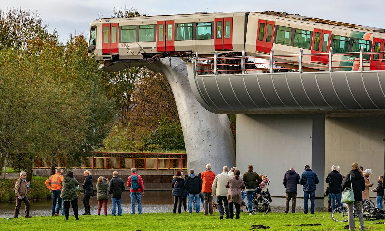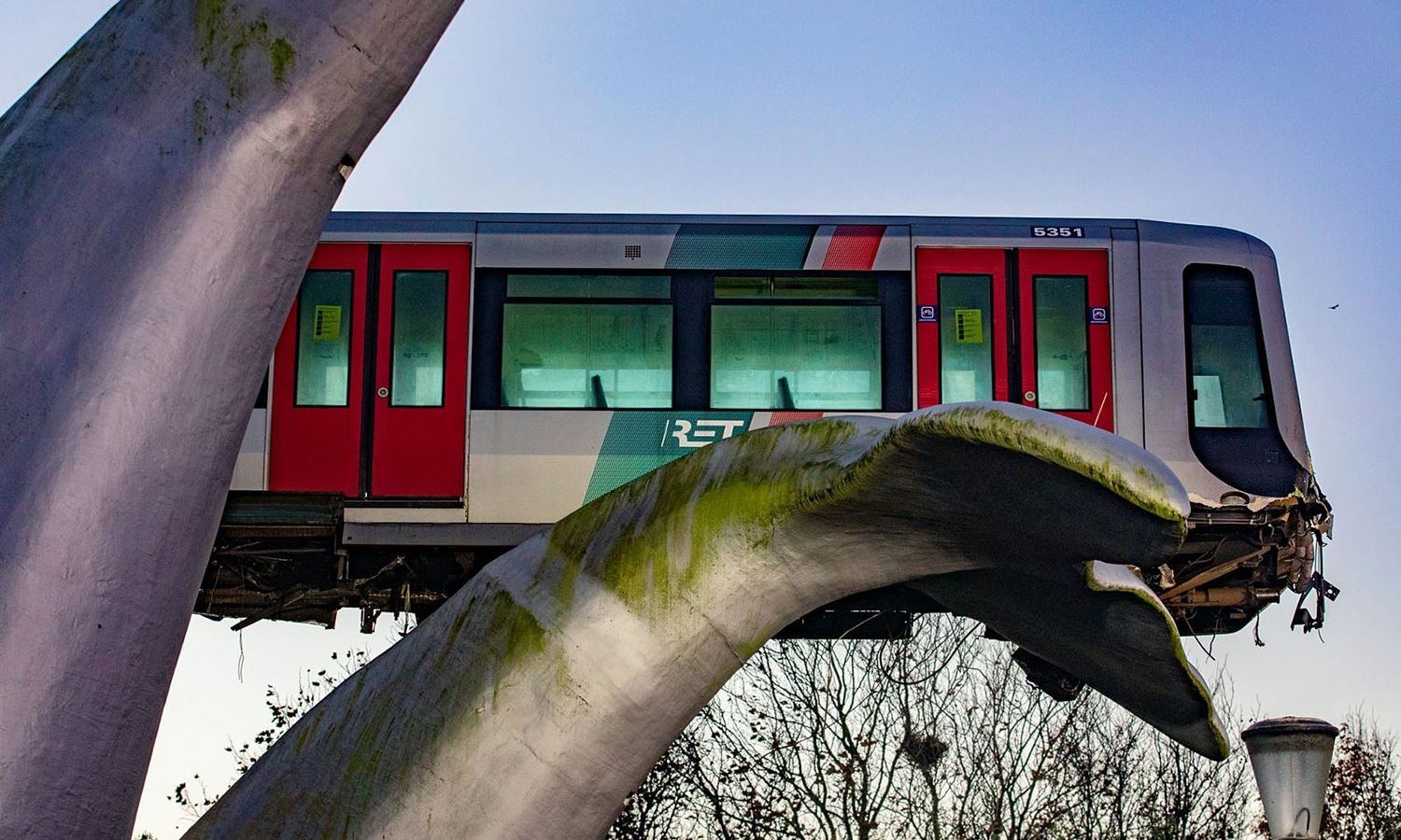 The silver sculpture was designed by architect Maarten Struijs and is made out of reinforced polyester, and it was installed at the station in 2002. While the cause of the incident hasn't been confirmed, it unfolded just after midnight when the train, which is part of the Rotterdam Metro network, shot through the automatic buffers at the end of the track, according to the train’s operator RET. It landed on one of the whale tails, saving it from plummeting 32 feet to the ground.