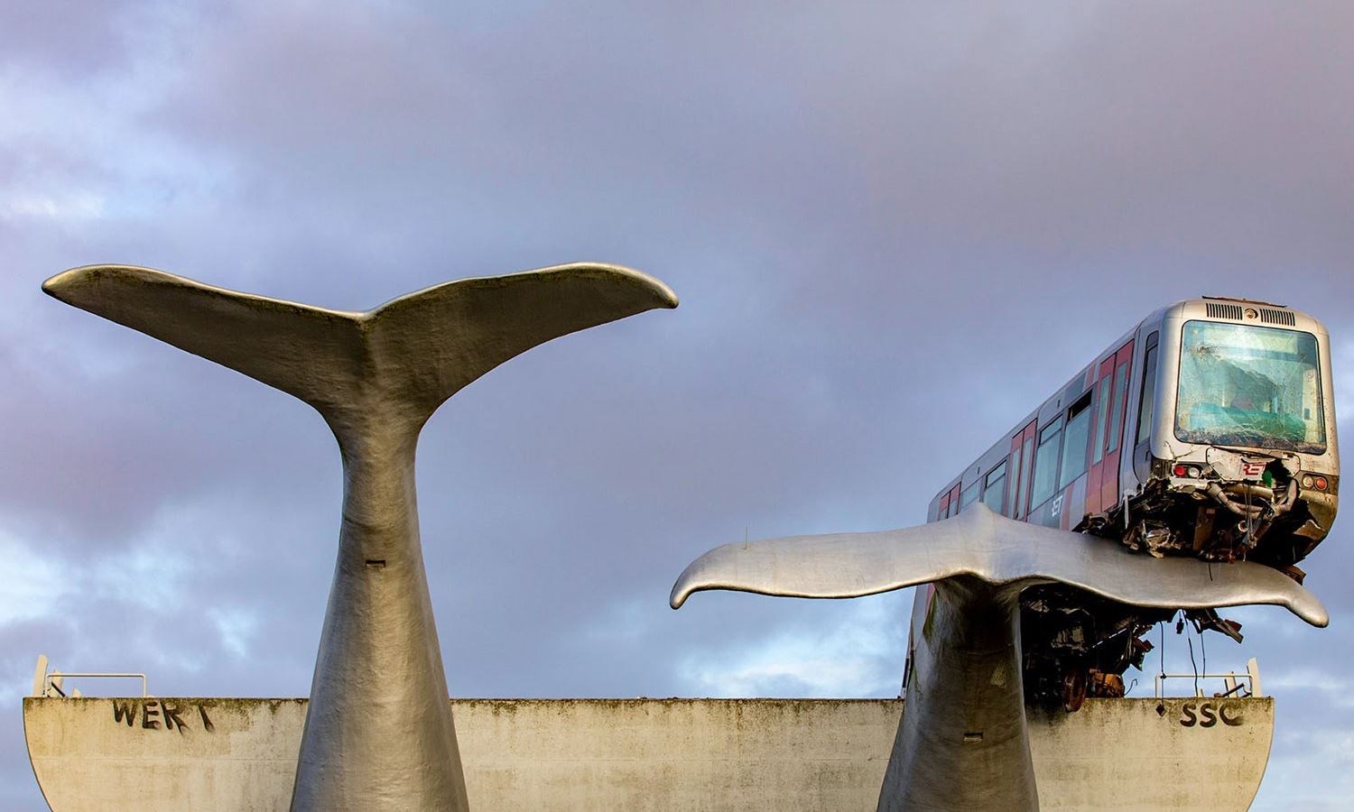 A giant art sculpture of two whale tails saved a Dutch train that overran the track from disaster by bringing it to a stop, preventing it from plunging to the ground below. The aptly-named sculpture is called, "Saved by the Whale's Tail," and the incident occurred at De Akkers metro station in Spijkenisse, near Rotterdam.