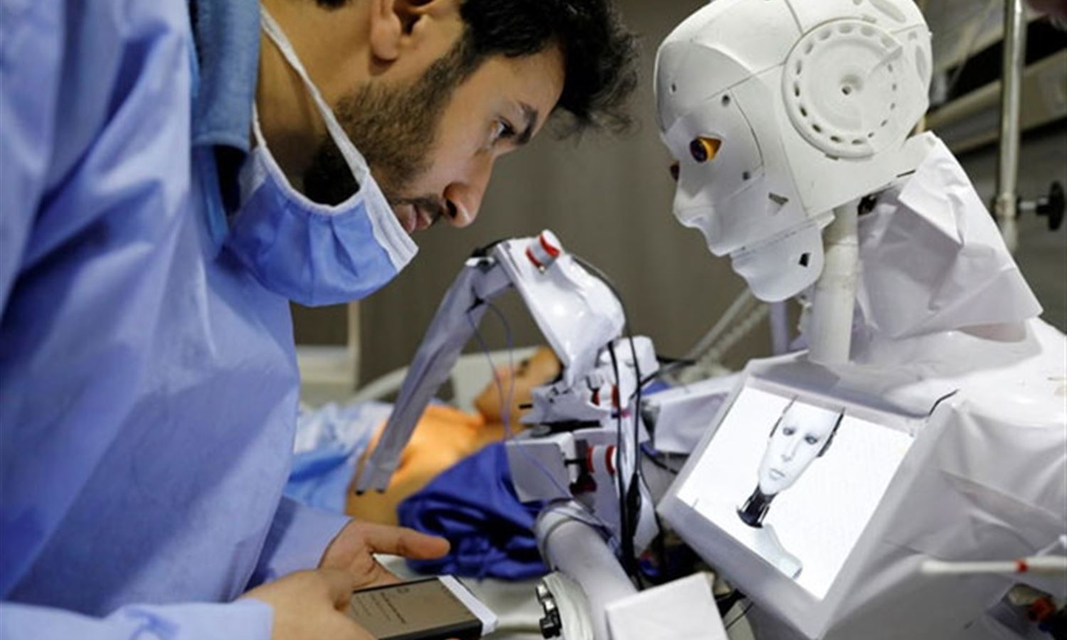 His robot, which has a human-like face and head and arms, can take blood tests, perform echocardiograms and X-rays, and display the results to patients on a screen attached to its chest.