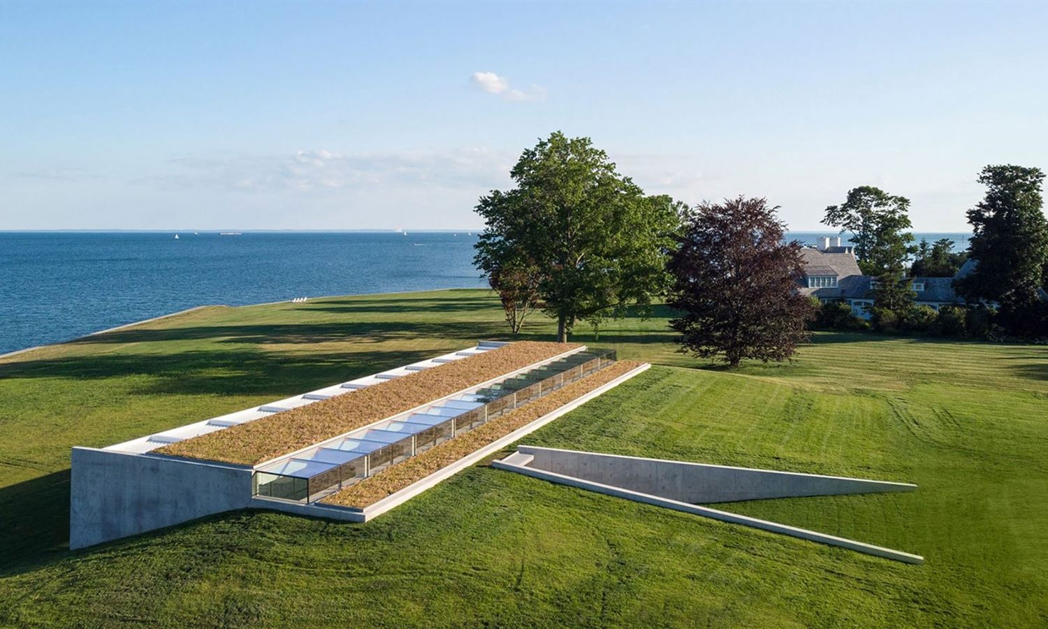 American studio Roger Ferris + Partners has tucked a bar-shaped volume that contains a swimming pool into a grassy hill overlooking a tidal estuary in Connecticut making it barely visible from certain vantage points. A green roof further helps the building merge with the landscape.