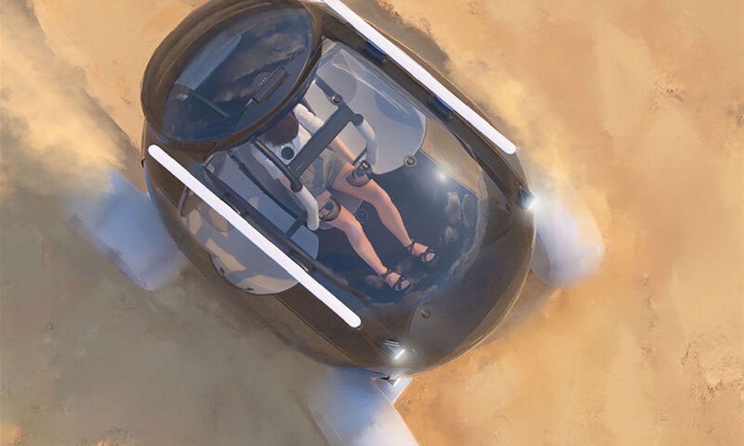 Guaranteed to scale mountains, prevail in snowy and sandy conditions, the modern all-terrain vehicle is compact but powerful. The interior is pod-like, enabling the flexibility of reconfiguration when needed. In addition, it can also turn "into a submersible for underwater adventures as the capsule cocoons the riders for a 360-degree view of the underwater life."