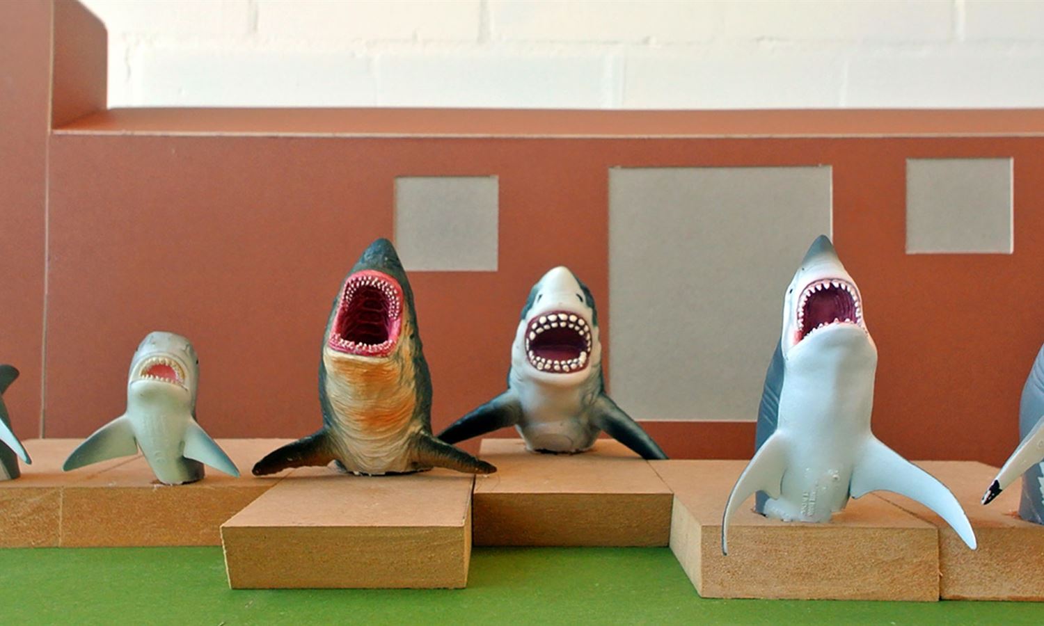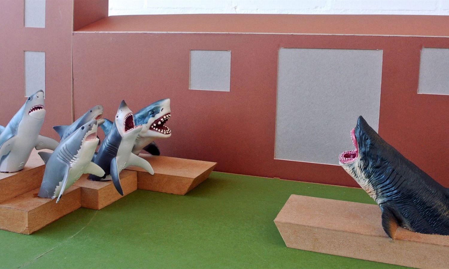 Titled SHARKS!, this year's Antepavilion will consist of six model sharks containing audio equipment. Positioned to look like they are leaping from the murky canal, the sharks will sing and give lectures on architecture and urbanism.
