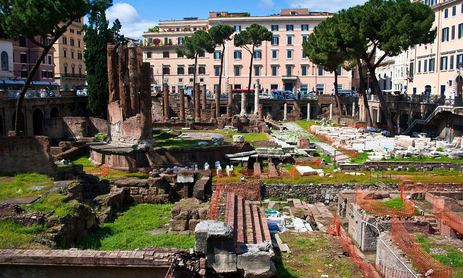 The sunken area is where the remains of four Republican-era temples are located, all built between the second and fourth centuries BCE. The Theatre of Pompey is also located there, with the Curia of Pompey located at its entrance.