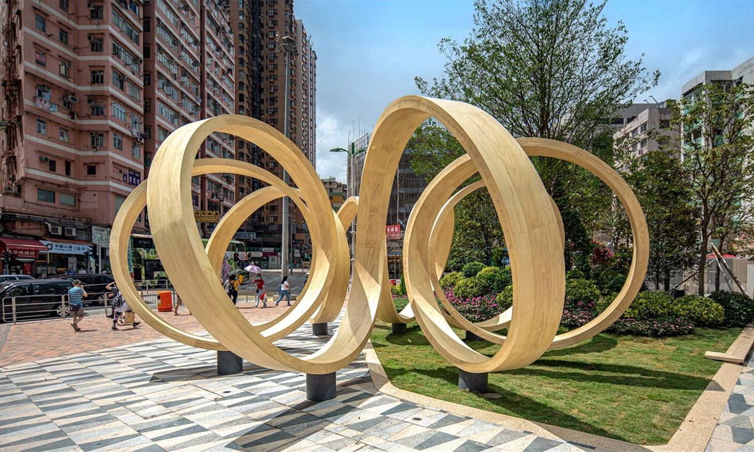 British designer Paul Cocksedge has inserted a timber structure of infinite loops into a public square in Kwun Tong, Hong Kong, named Time Loop which aims to transform the space into a vibrant place for reflection and socialising.