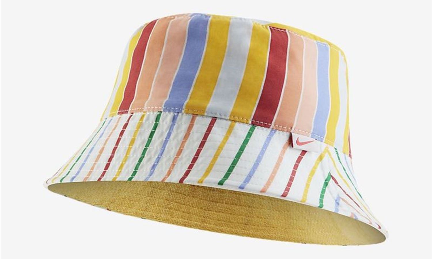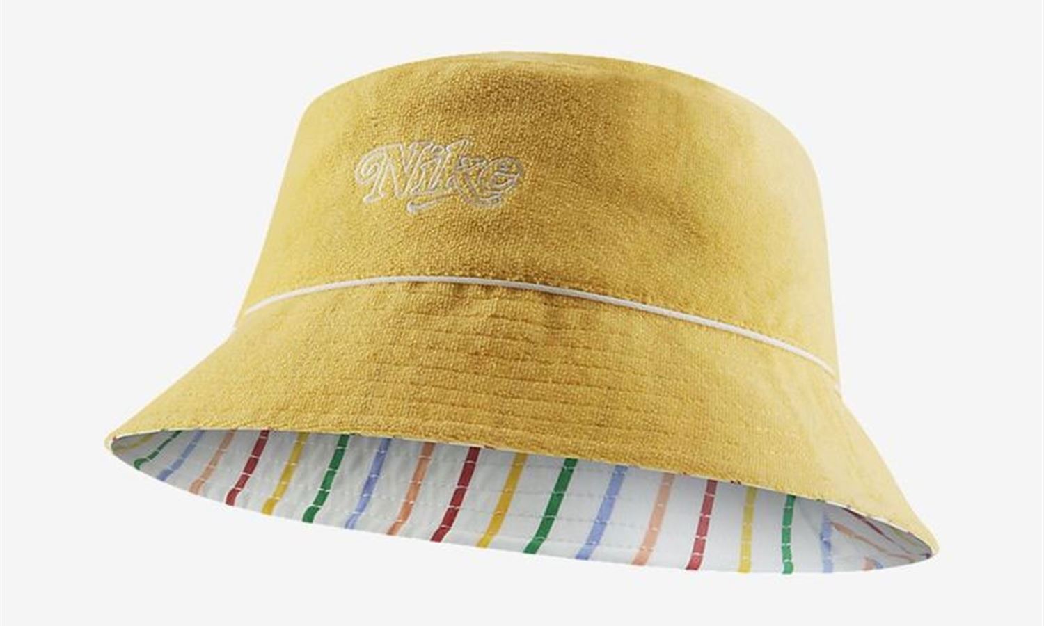 Nike's Retro Hat is a 90s-inspired bucket hat that makes a bold fashion statement. The hat is crafted from polyester French Terry, with a different design on either side. One side features a Topaz Gold yellow print with a vintage Nike logo embroidered on the front in white font. The other side features a rainbow-striped design with a small loop label on the brim. As Nike puts it, "each side offers its own personality you can choose to fit your mood".