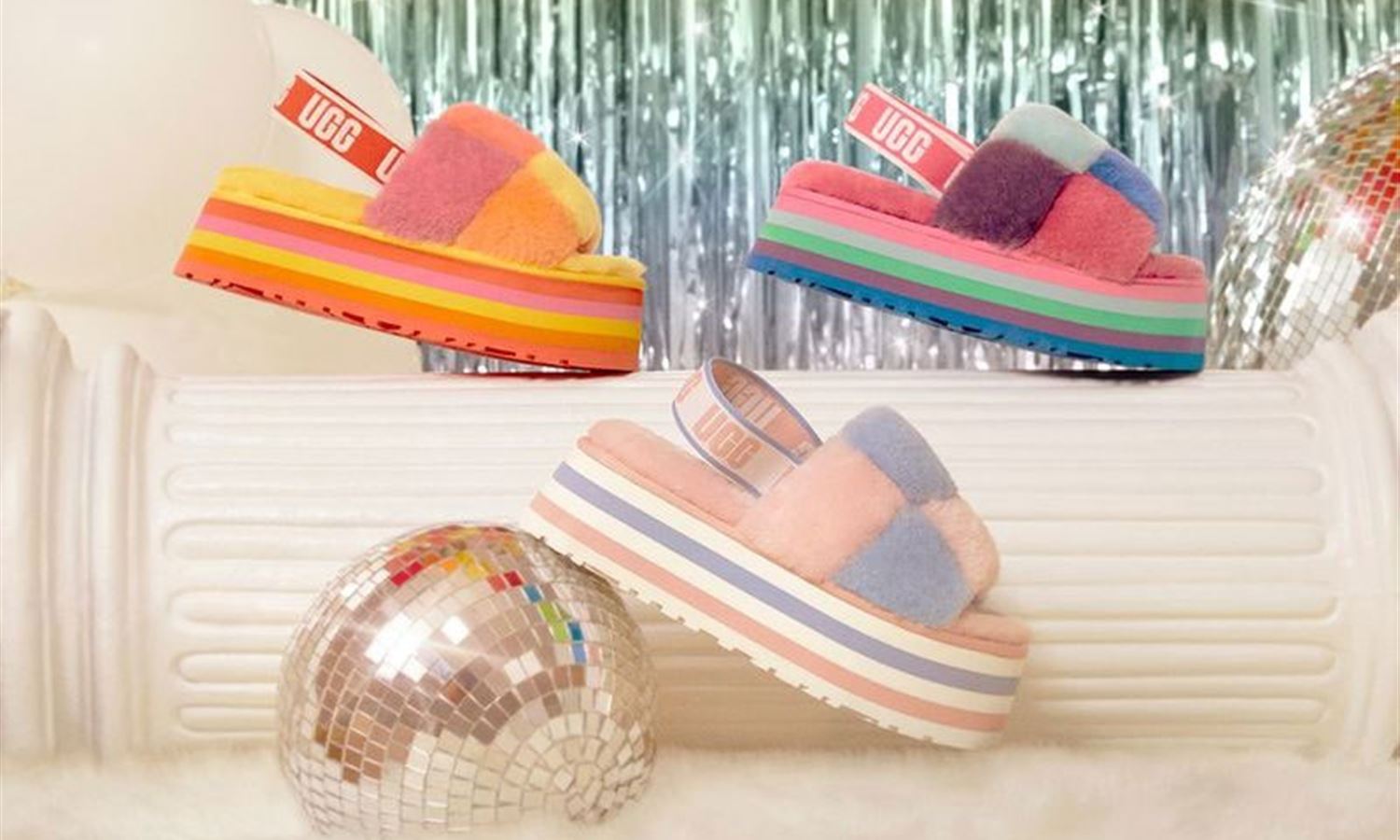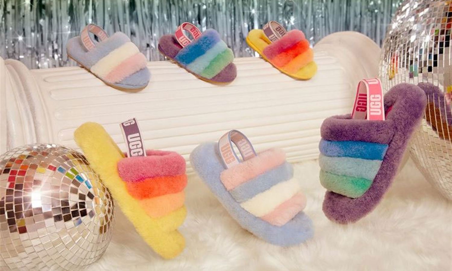 In honor of Pride Month 2020, UGG teamed up with GLAAD and the Pacific Pride Foundation to create an all-gender-slides collection. The new collection features the Disco Checker Slide and Fluff Yeah silhouettes in a range of bright and colorful hues. The slides themselves are made from fluffy material and the brand's UGGplush wool blend. These are slides that can be worn by people of all genders, as demonstrated by a star-studded campaign launched by the brand.