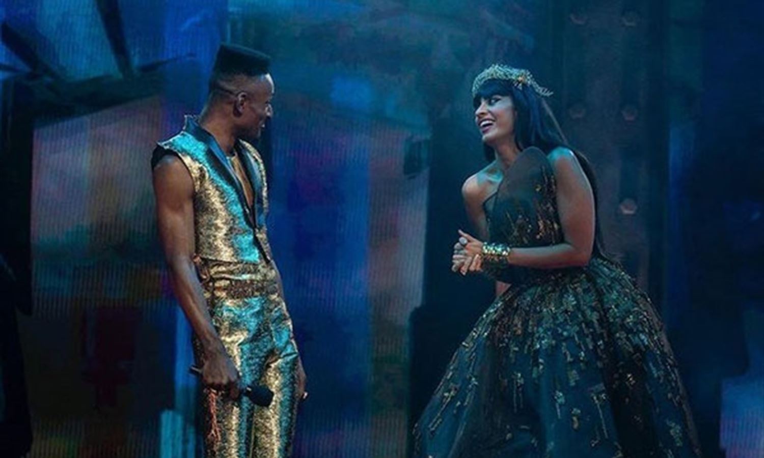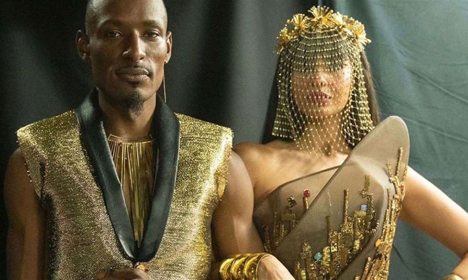 For her part, Jamila wore a smoky asymmetric dress decorated with gold beads. The dress was tied at the waist and a wide skirt appeared. She adorns the look with a stunning gold head covering and thick bracelets around her wrists.