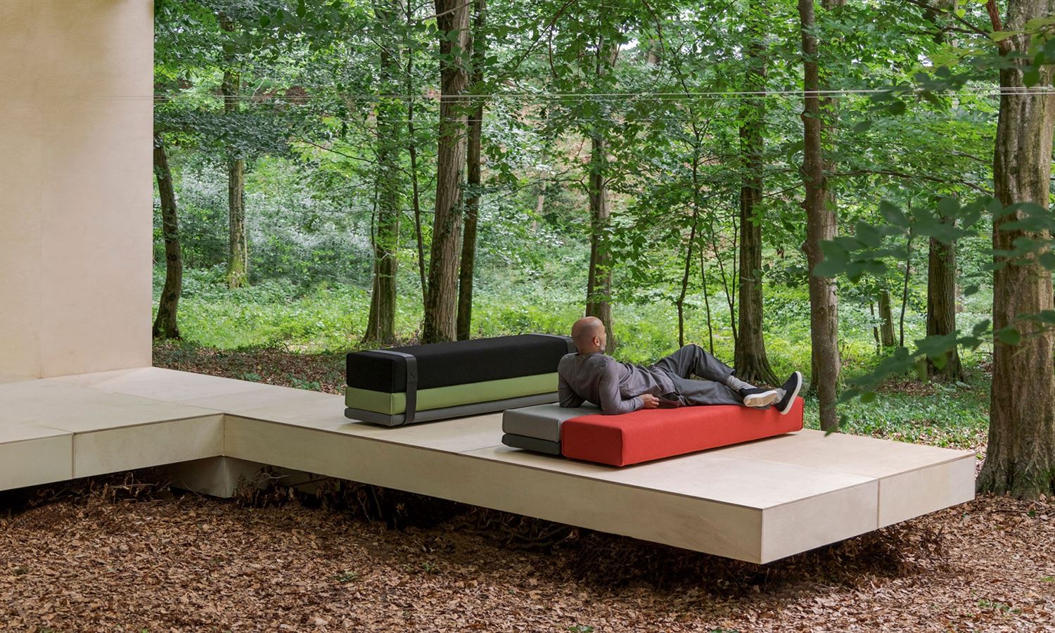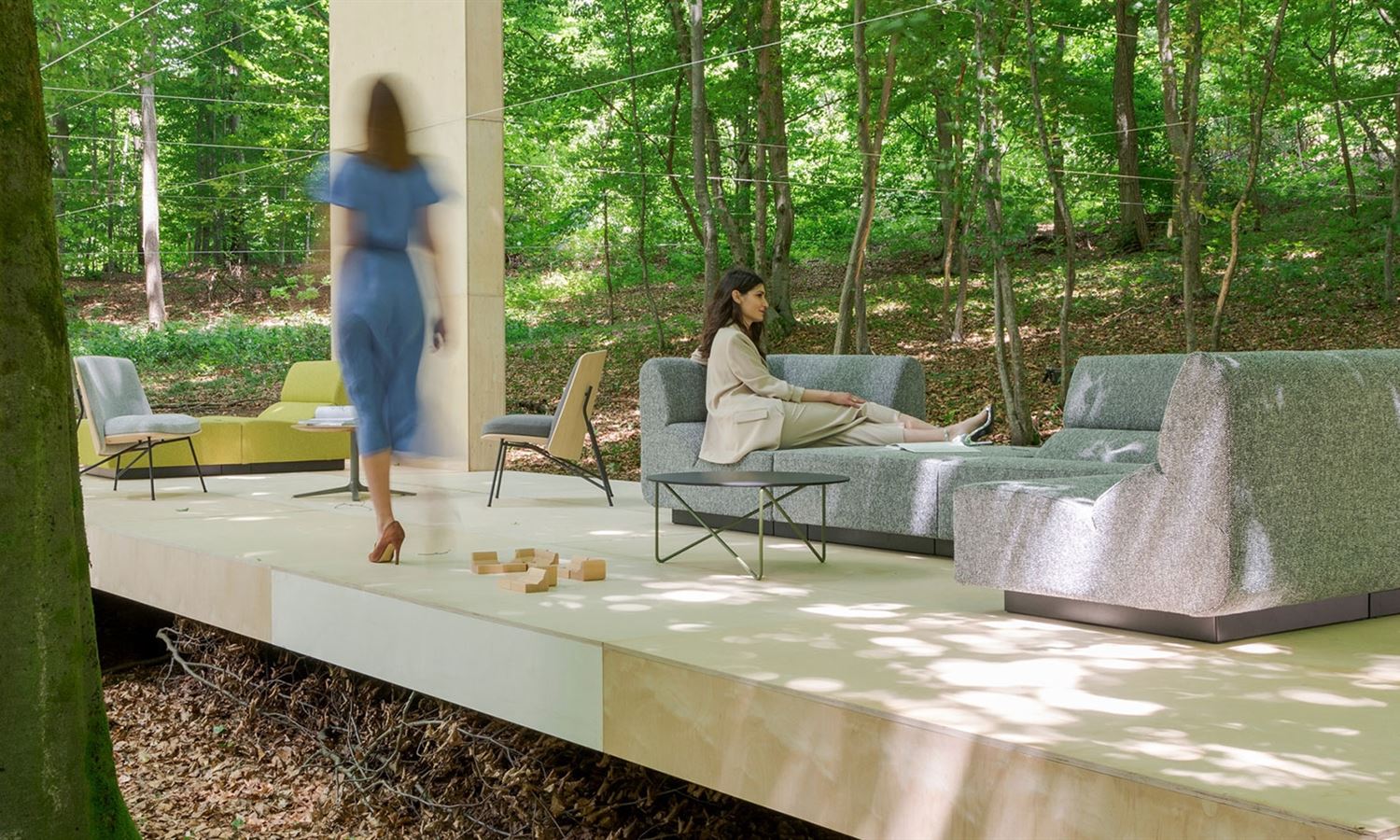 Islands that make up the pavilion come in different forms, some are simple square blocks, while others are L-shaped or have upward-standing timber plinths that resemble walls. Some of the islands also overlap to form stepped-level areas.