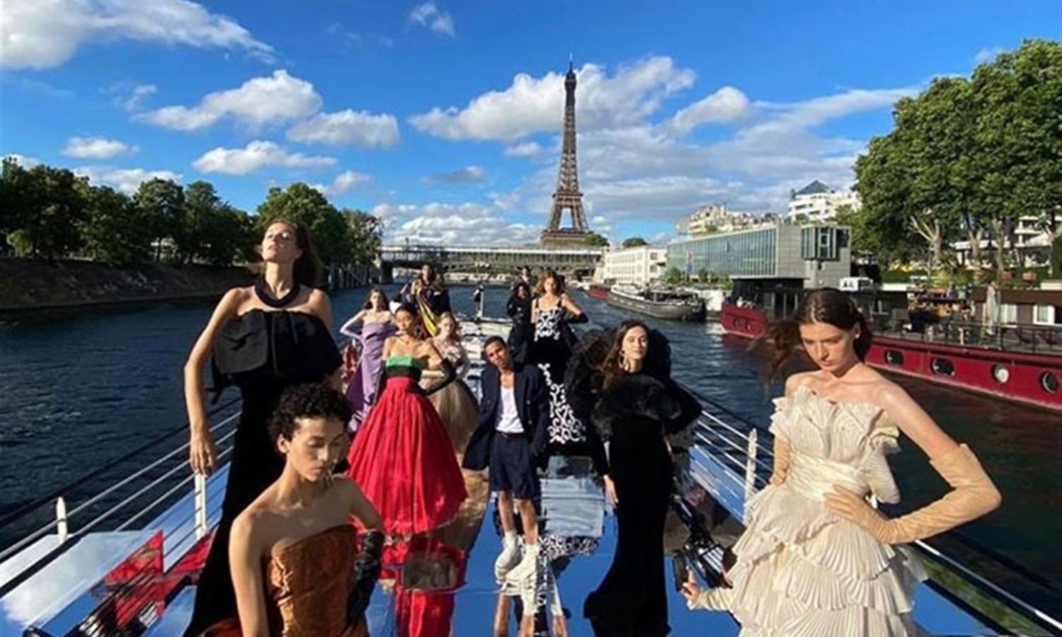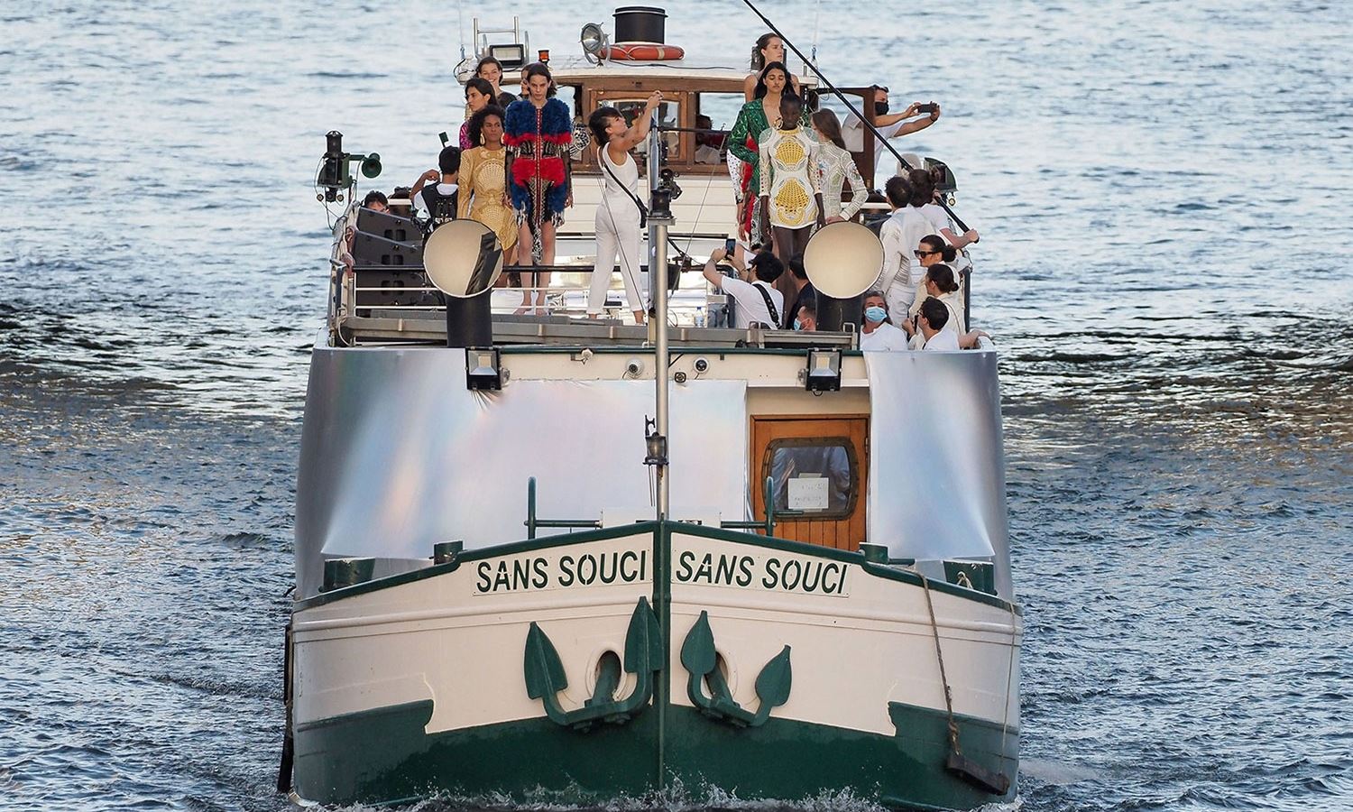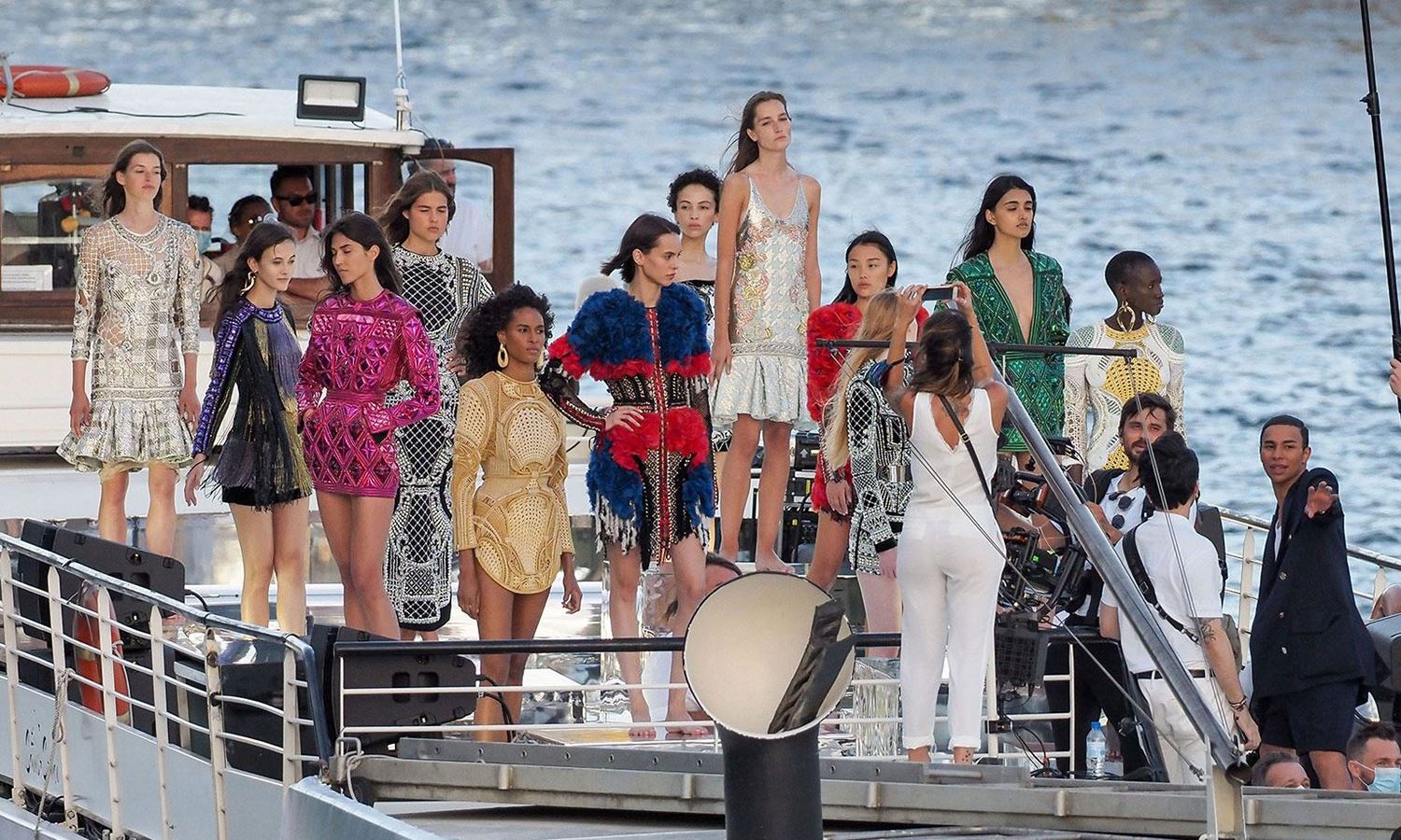 Last Sunday, Olivier Rousteing along with 21 models sailed down the Seine on what might have been the most fashionable barge to ever grace the city’s famous waterway. Featuring looks from the Maison’s couture archives and keeping a two-meter distance between each model.