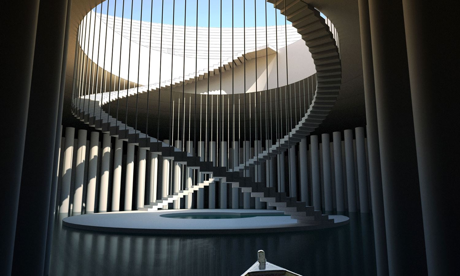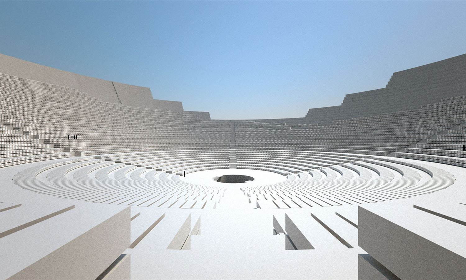 Slim white struts would support the underside, while the inside would hold concentric rings of sarcophagi, stepped like an auditorium.