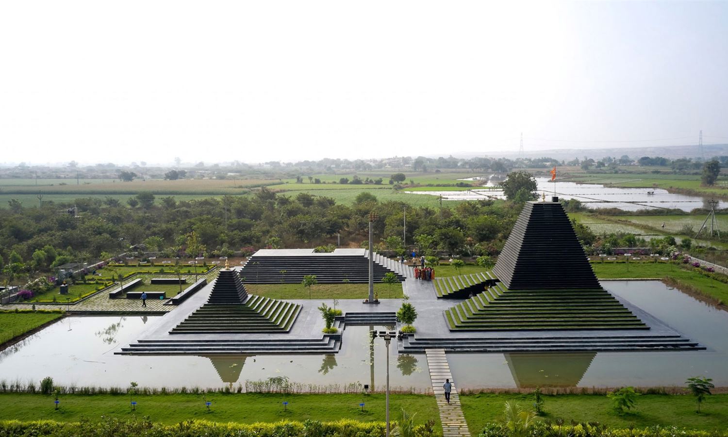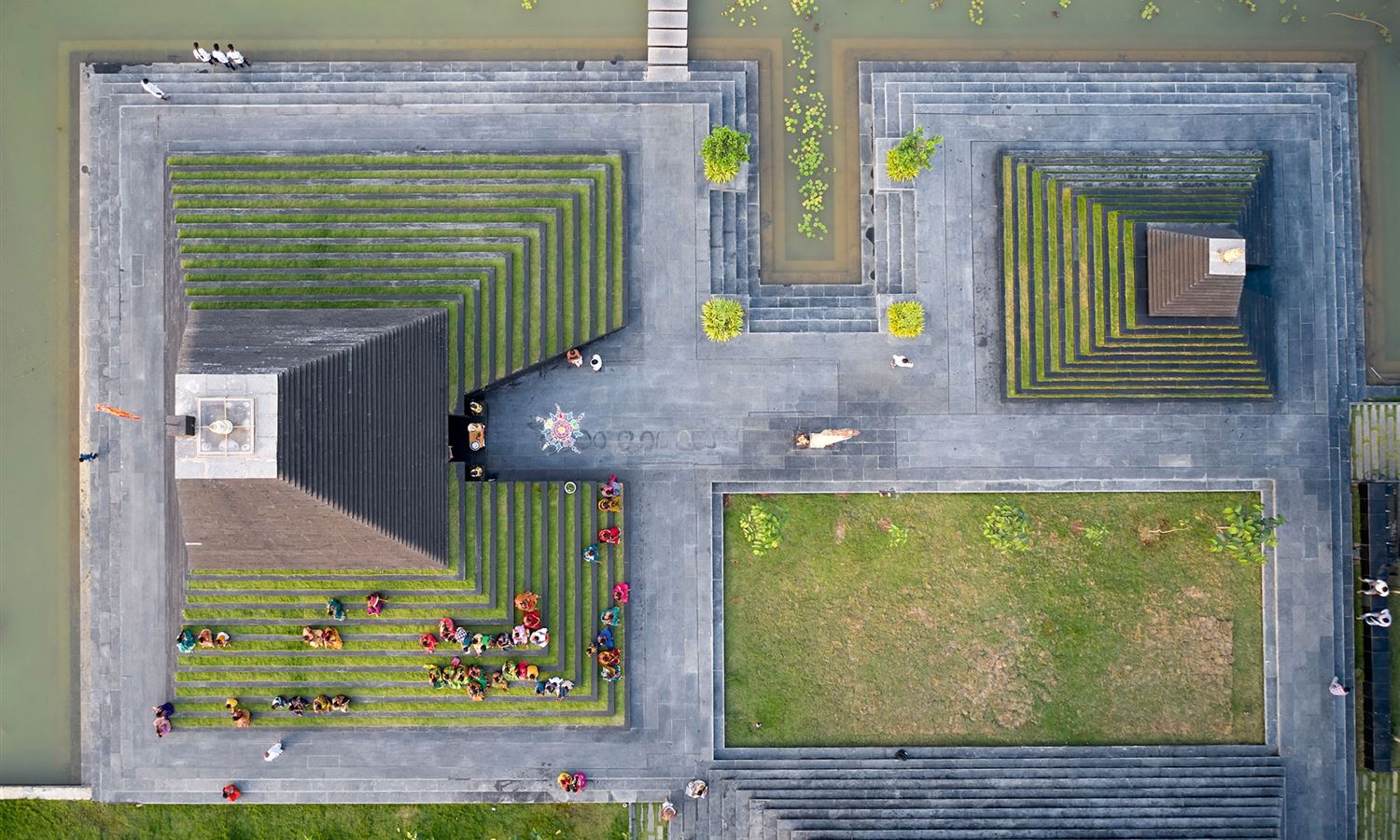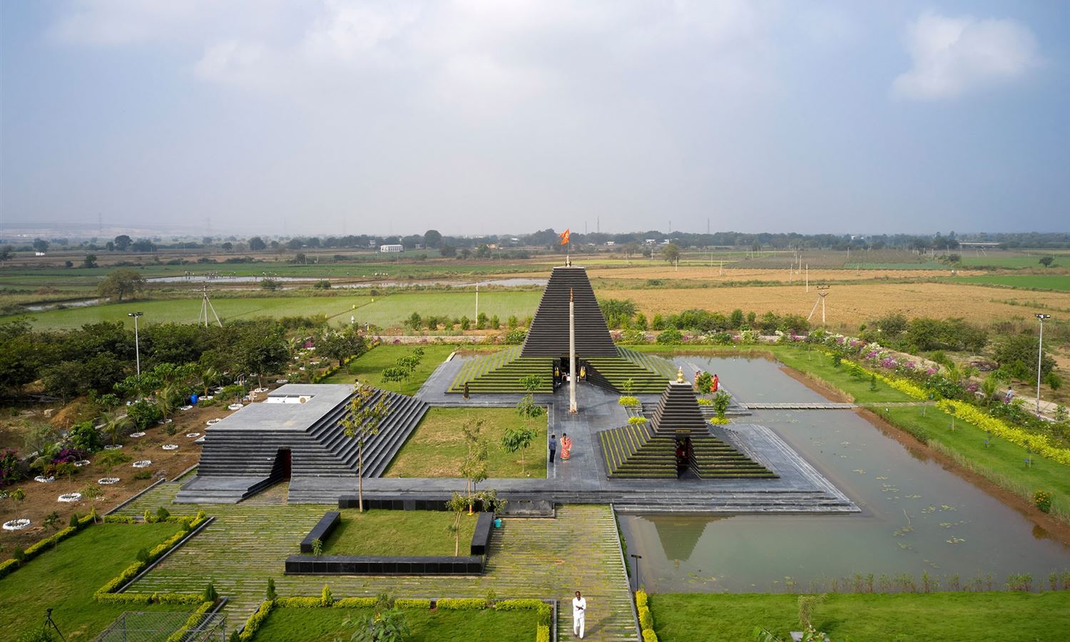 The architecture studio created the stepped temples from local black limestone slabs to create a modern take on the traditional Hindu temple forms, and were also used to planted it with greenery on the lower levels to buffer the interiors from the heat.