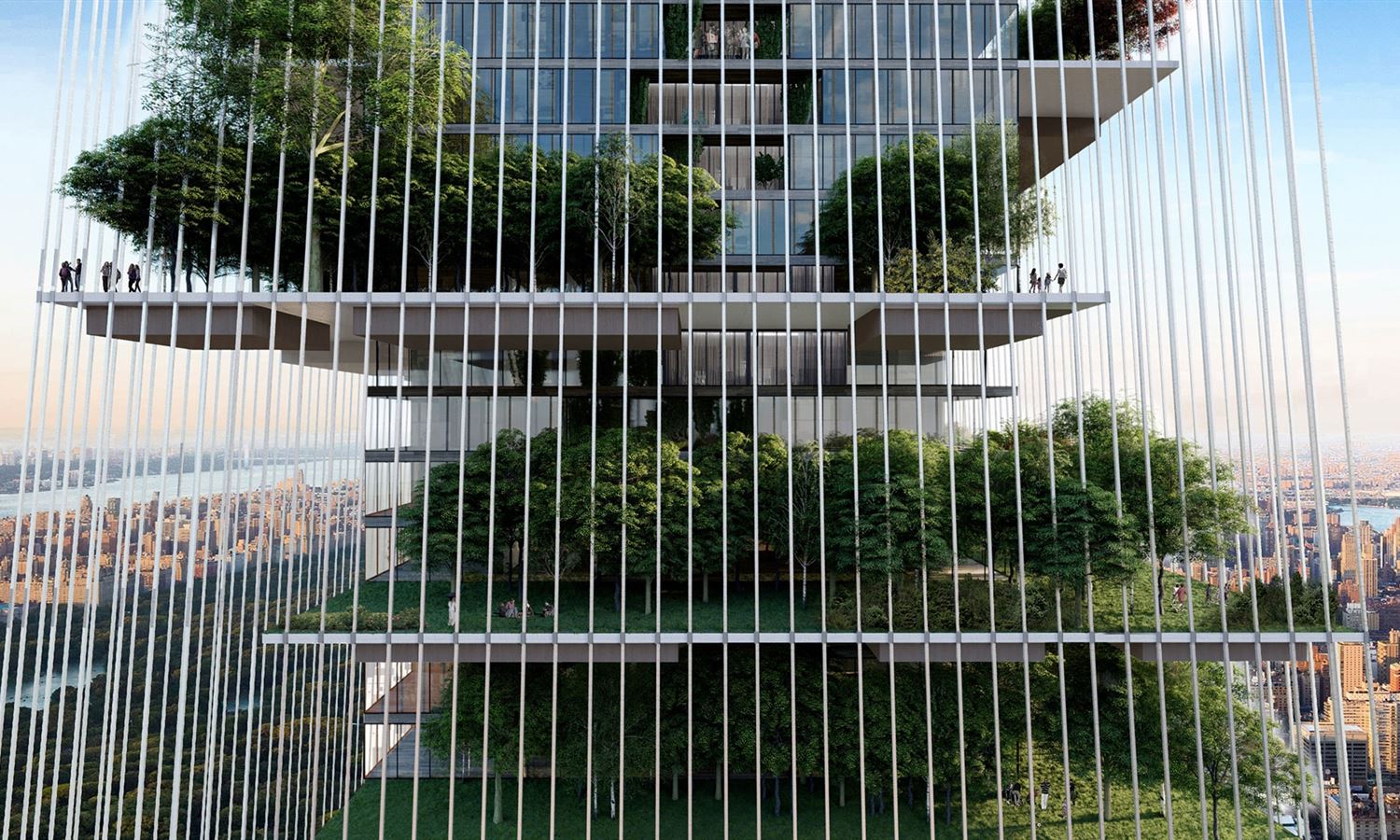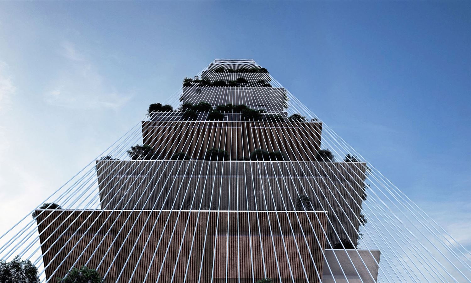 A curtain of steel cables would form the tapered structure and would hold up hanging garden platforms that run around a glazed tower in the centre.
